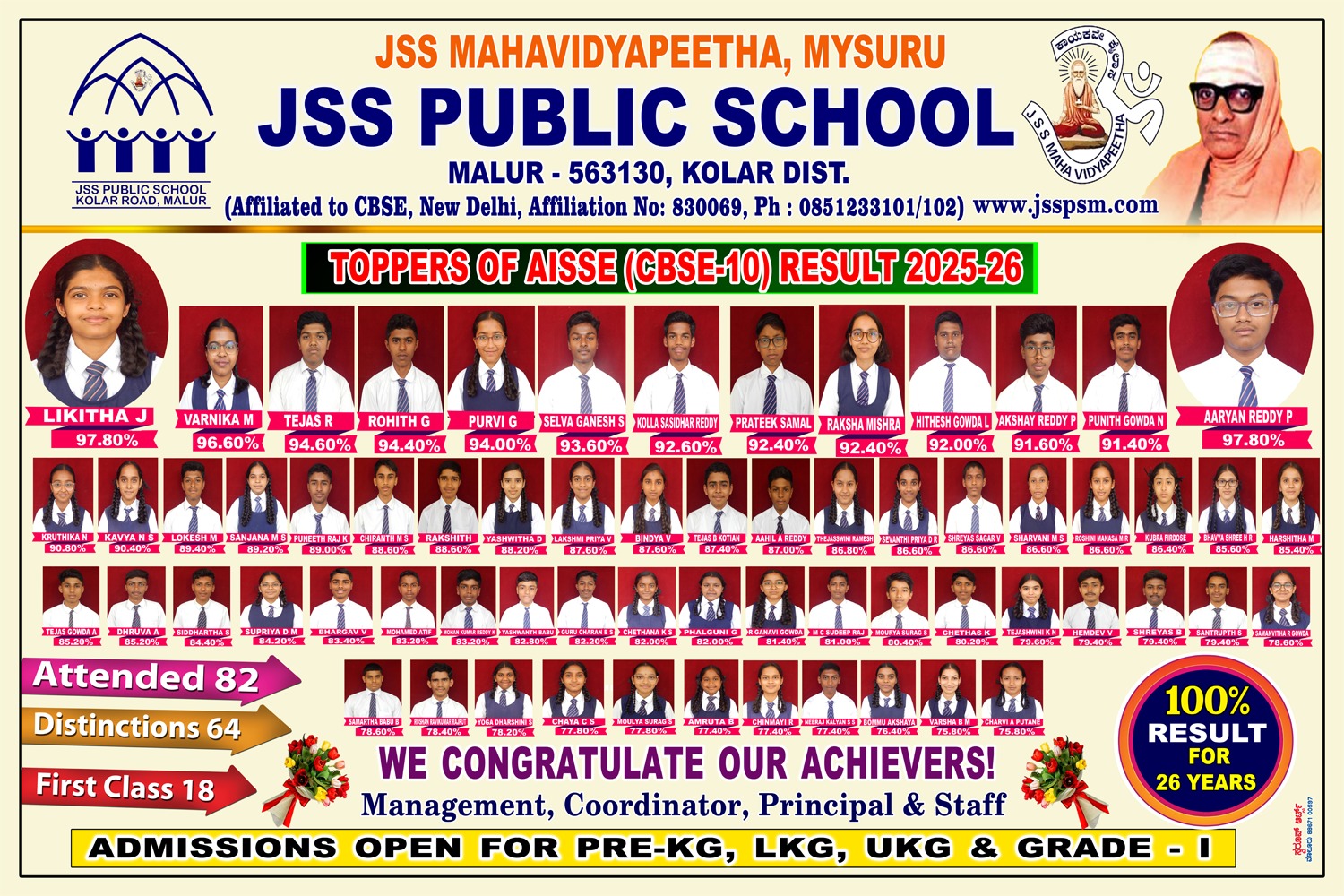 JSS Public School Malur is one of the 17 public schools run by JSS Mahavidyapeetha. It was started in the year 1993. It is affiliated to the CBSE Delhi Viz.830069